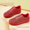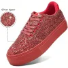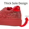 These red low-top sneakers feature a glitter-textured upper with a classic lace-up design and round toe shape. The platform sole and cushioned interior provide a balanced combination of style and everyday comfort, while the vibrant finish creates a distinctive and eye-catching look.